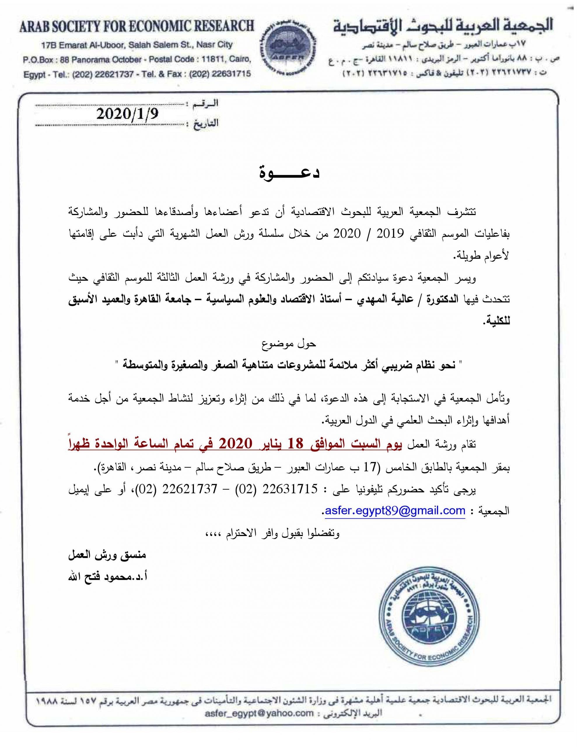 تزمع الجمعية العربية للبحوث الاقتصادية عقد ورشة العمل الثالثة للموسم الثقافى 2020/2019 تحت عنوان “نحو نظام ضريبي أكثر ملائمة للمشروعات متناهية الصغر والصغيرة والمتوسطة ” تتحدث فيها الدكتورة / عالية المهدي – أستاذ الاقتصاد والعلوم السياسية – جامعة القاهرة والعميد الأسبق للكلية. وذلك يوم السبت الموافق 18 يناير 2020 فى تمام الساعة الواحدة ظهرا بمقر الجمعية بالطابق الخامس (17 ب عمارات العبور – طريق صلاح سالم – مدينة نصر، القاهرة). يرجى تأكيد حضوركم تليفونيا على : 22631715 (02) – 22621737 (02)، أو على إيميل الجمعية : asfer.egypt89@gmail.com.