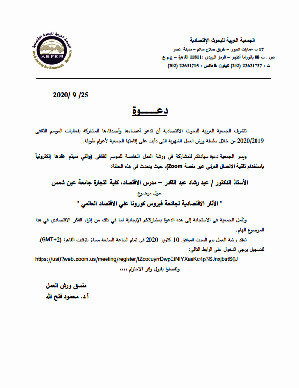 تتشرف الجمعية العربية للبحوث الاقتصادية أن تدعو أعضاءها وأصدقاءها للمشاركة بفعاليات الموسم الثقافى 2020/2019 من خلال سلسلة ورش العمل الشهرية التى دأبت على إقامتها الجمعية لأعوام طويلة.