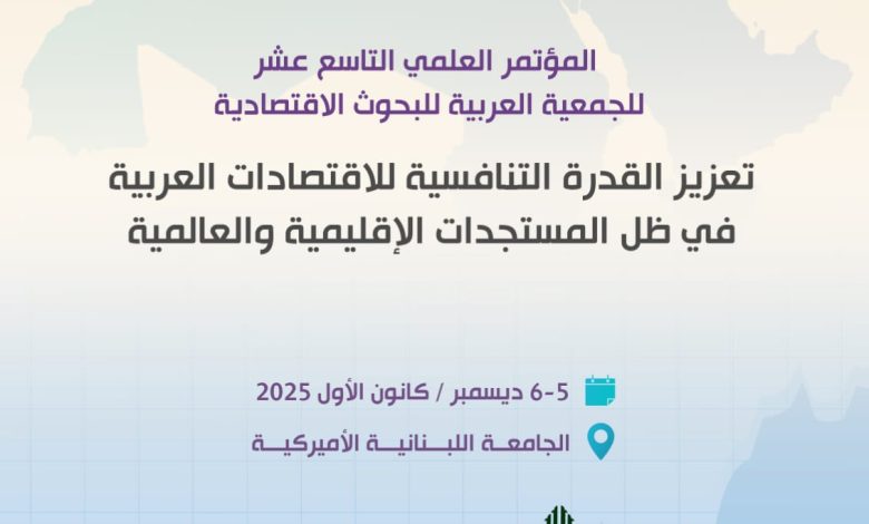 تنظم الجمعية العربية للبحوث الاقتصادية مؤتمرها العلمي التاسع عشر تحت عنوان: “تعزيز القدرة التنافسية للاقتصادات العربية في ظل المستجدات الإقليمية والعالمية” في العاصمة اللبنانية بيروت بمقر الجامعة اللبنانية الأميركية، وذلك يومي 5 و6 ديسمبر/ كانون الأول 2025.