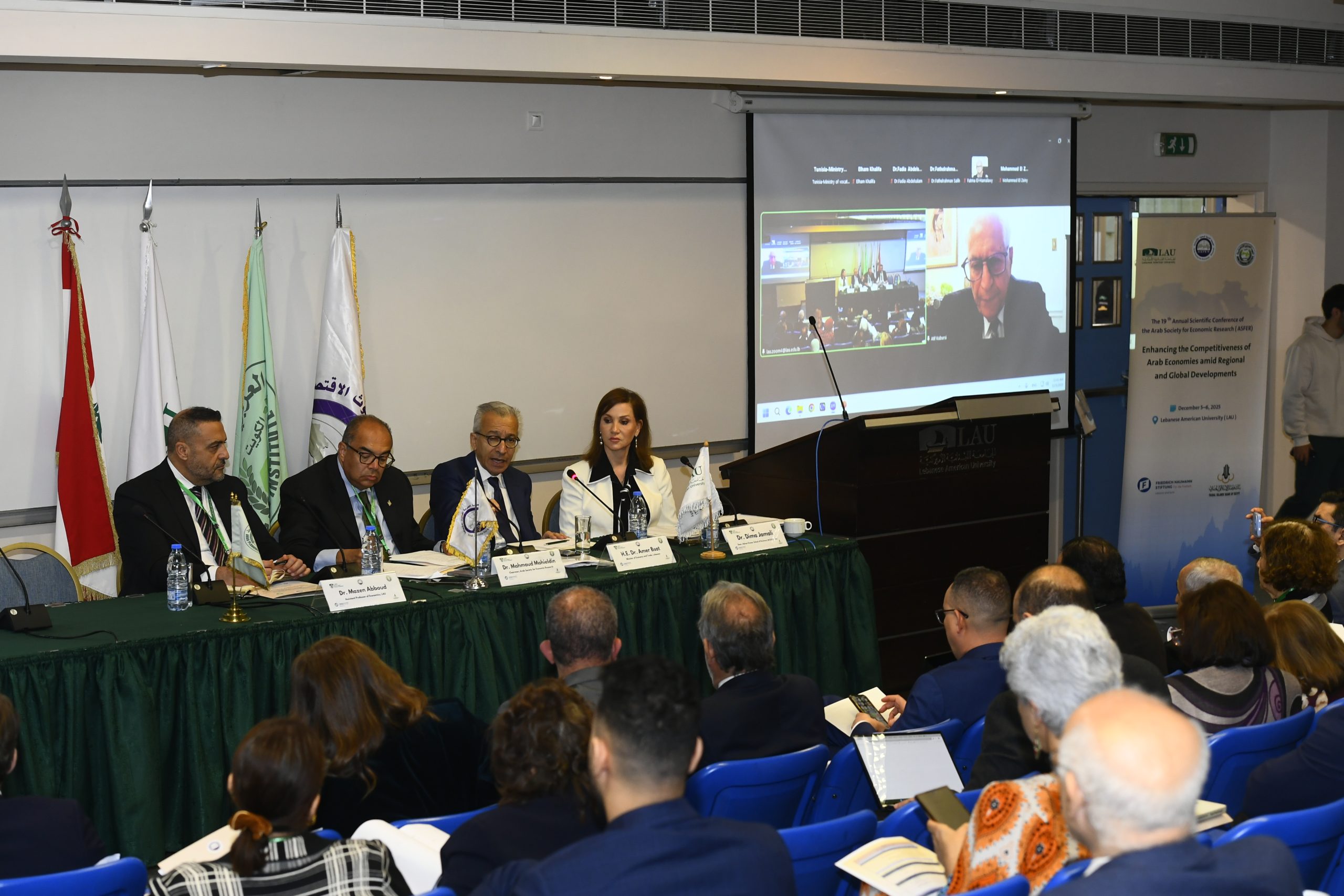 والدكتور / عاطف قبرصي – أستاذ الاقتصاد بجامعة ماكمستر بكندا وعضو مجلس إدارة الجمعية (افتراضياً)، والدكتور / مازن عبود – أستاذ الاقتصاد المساعد بالجامعة اللبنانية الأمريكية.وقام برئاسة الجلسة الدكتورة ديما جمالي عميدة كلية عدنان القصار لإدارة الأعمال، وبحضور نخبة من الاقتصاديين والشخصيات العامة وخبراء الاقتصاد وصناع القرار والأكاديميين والباحثين.